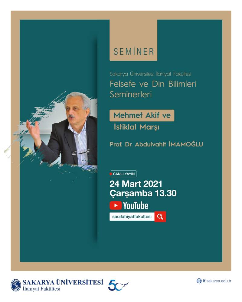 Felsefe ve Din Bilimleri Bölüm Seminerleri kapsamında Prof. Dr. Abdulvahit İmamoğlu tarafından verilecek olan “Mehmet Akif ve İstiklal Marşı” konulu seminer 24 Mart 2021 Çarşamba günü saat 13:30’da YouTube kanalımızdan (www.youtube.com/sauilahiyatfakultesi) canlı yayınlanacaktır.