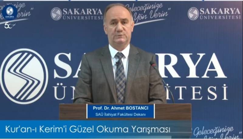 Programda konuşan ve sözlerine yarışmaya duyulan ilgiye teşekkür ederek başlayan Dekanımız Prof. Dr. Ahmet Bostancı da, içinde bulunduğumuz sıkıntılı dönemin bir an önce atlatılıp önceki yaşantımıza döndükten sonra yarışmanın da önceden olduğu gibi yüz yüze gerçekleştirilebilmesi niyazında bulundu. Sonrasında Hz. Peygamber’in (s.a.) “Sizin en hayırlınız Kur’an’ı öğrenen ve öğreteninizdir” hadisini hatırlatan Prof. Bostancı, Kur’an’ın hidayet rehberi olmasının mânasına nüfuz edilmesi, mesajının benimsenmesi ve hayata aktarılması ile mümkün olacağını vurguladı. Daha sonrasında Fakültemizde Kur’an’ı anlamak maksadıyla öğrencilere İslamî ilimlerin büyük bir dikkat ve titizlikle öğretildiğini belirten Prof. Bostancı, Sakarya İl Müftülüğü ile ortak yürütülen “İlahiyat Eğitimi İle Eş Zamanlı Hafızlık Projesi” kapsamında hafızlığını tamamlayan öğrencilerin de kendileri için ayrıca bir mutluluk vesilesi olduğunu ifade etti. Prof. Bostancı, yarışmaya İlahiyat Fakültesi dışındaki fakültelerden de öğrencilerin katılması ve Çalışma Ekonomisi Bölümü’nden bir öğrencinin finale kalmış olmasından dolayı duydukları memnuniyeti belirttikten sonra yarışmanın düzenlenmesinde büyük emek sarf eden topluluk akademik başkanı Öğr. Gör. Hülya Afacan’a ve öğrencilerden Abdülkadir Yavuz’a özel teşekkürlerini iletti. Doç. Dr. Ali Karataş başkanlığındaki jüri heyetine, yarışmada takdim edilecek ödüllere katkıları sebebiyle Sakarya İl Müftülüğü’ne, Adapazarı İlçe Müftülüğü’ne, Karacalar Şirketler Grubu’na, Trabzonlu iş adamlarına, yarışmanın SAÜ stüdyosundan yayınlanmasını sağlayan SAÜ Rektörü Prof. Dr. Fatih Savaşan’a ve yayını gerçekleştiren İsmail Kurtuldu başkanlığındaki İletişim Koordinatörlüğü ekibine şükranlarını sunan Prof. Dr. Ahmet Bostancı, yarışmaya katılan ve her birini bir inci olarak gördüğünü ifade ettiği yarışmacıları tebrik ederek konuşmasını sonlandırdı.