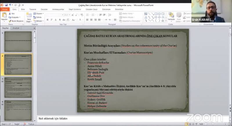 Daha sonra Batı’da çağdaş Kur’ân araştırmalarında hangi konuların öne çıktığına değinen Dr. Kabakçı ilk olarak metin bütünlüğü arayışlarının üzerinde durdu. İkinci olarak Kur’ân mushafları yazmaları hakkındaki araştırmalara işaret eden Dr. Kabakçı, araştırmaların son yıllarda Kur’ân’ın metnine yoğunlaştığını belirtti.