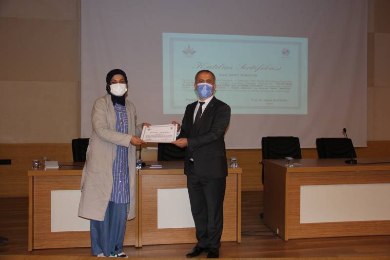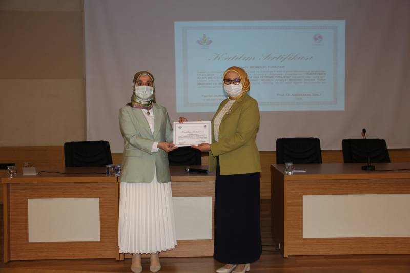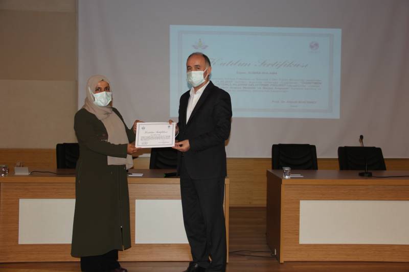 Programın devamında Akyazı Kız Anadolu İmam Hatip Lisesi Meslek Dersleri Öğretmeni Melike Şeyma Ayyıldız öğretmenler adına bir teşekkür konuşması yaptı. Ardından projede görev alarak ders veren İlahiyat Fakültesi öğretim üyelerinden Prof. Dr. Hayati Yılmaz, Prof. Dr. Osman Güman, Doç. Dr. Hamza Ermiş, Doç. Dr. Ali Karataş ve Öğr. Gör. Reda Elsayed’e İl Milli Eğitim Müdürü Fazilet Durmuş ve Rektörümüz Prof. Dr. Fatih Savaşan tarafından teşekkür belgesi verildi. Program, projede yer alan öğretmenlere katılım belgelerinin İl Milli Eğitim Müdürü Fazilet Durmuş, Dekanımız Prof. Dr. Ahmet Bostancı ve Rektörümüz Prof. Dr. Fatih Savaşan tarafından takdim edilmesinin ardından sona erdi.