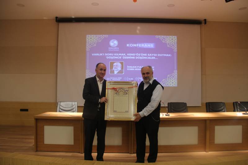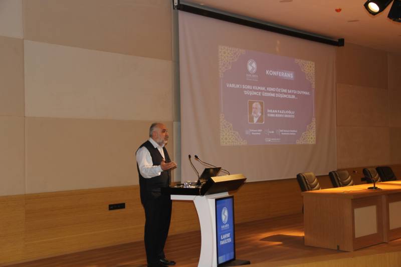 Fakültemiz geleneksel “Çarşamba Konferansları” kapsamında İstanbul Medeniyet Üniversitesi öğretim üyelerinden Prof. Dr. İhsan Fazlıoğlu tarafından 8 Kasım 2021 tarihinde “Varlık'ı soru kılmak, kend'öz'üne saygı duymak: 'Düşünce' üzerine düşünceler...” konulu konferans gerçekleştirildi. Arş. Gör. Semra Kaya Aıtaourı’nin sunuculuğunu yürüttüğü ve Rektörümüz Prof. Dr. Fatih Savaşan, Dekanımız Prof. Dr. Ahmet Bostancı ve öğretim üyelerinin katıldığı konferansa öğrenciler yoğun ilgi gösterdi.