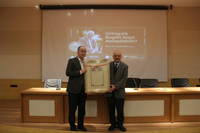 Prof. Dr. İsmail Kara, konuşmasının başında “İslamcılık Bugün Nasıl Anlaşılabilir?” sorusunun dünyanın, uluslararası siyaset merkezlerinin, İslam ülkelerinin siyasi merkezlerinin yakından ilgilendiği bir soru olduğunu ifade etti. Siyasî merkezlerin bu soruyla ilgilerinin Müslümanları ve İslâm dünyasını belli istikametlere doğru yönlendirmek şeklinde işlediğini belirten Prof. Dr. Kara, uluslararası siyaset merkezlerinin ve İslâm dünyasının siyasî merkezlerinin kendi politikaları istikametinde islâmcılığı desteklediğini ya da kösteklediğini söyledi. İslamcılık konusunun İslâmî endişe sahipleri, İslamî ilimlerle uğraşanlar ve İslam dünyası için hayati bir mesele olduğunu vurgulayan Kara, “Çünkü İslam dünyasının bir buçuk-iki asırlık son tecrübesi içerisinde bu düşüncenin ve bu hareketin çok önemli etkileri olmuştur… İslam dünyası için hususen üst düzey dinî eğitim alanlar için bu hayatî derecede önemli bir meseledir. Dolayısıyla soruyu önemsemek lazım.” şeklinde konuştu.
