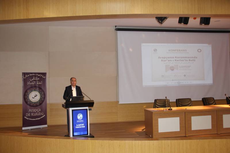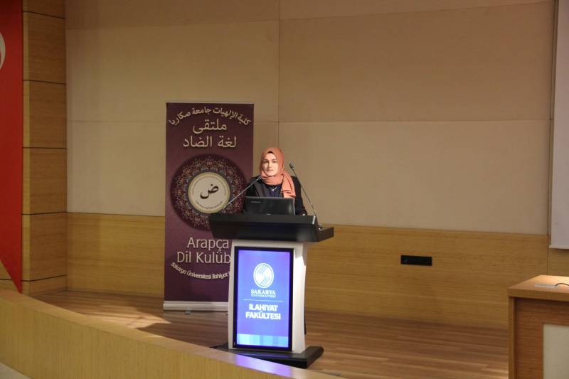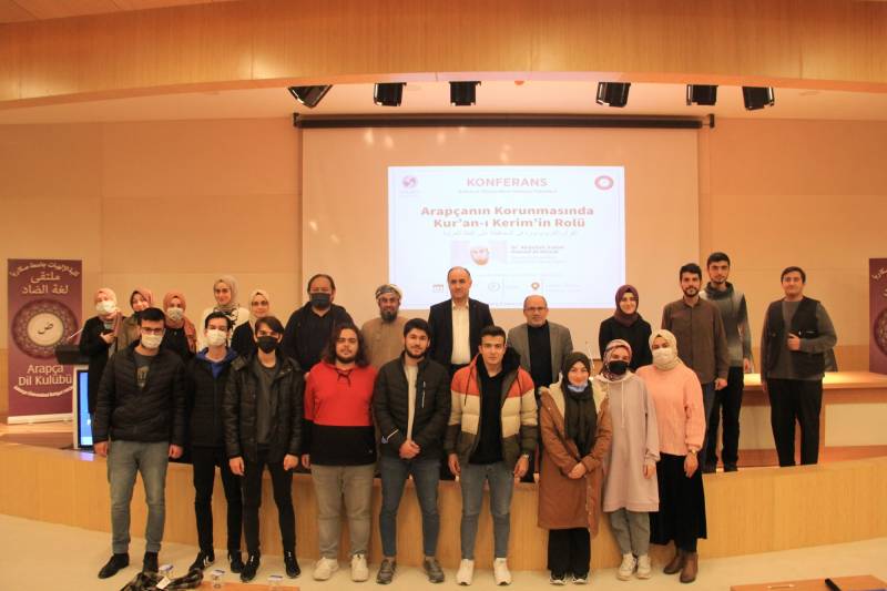 Fakültemiz Arapça Öğrenci Topluluğu (Multeka Lugati’d-dât) tarafından “Arapçanın Korunmasında Kur’an-ı Kerim’in Rolü” konulu konferans düzenlendi. Konferansa Fakültemizde misafir öğretim üyesi olarak bulunan Umman Sultan Kabus Üniversitesi Öğretim Üyesi Dr. Abdullah el-Hinâî konuşmacı olarak katıldı. YouTube kanalımızda da canlı olarak yayınlanan ve Arapça olarak gerçekleştirilen konferans hocalarımızdan Öğr. Gör. Sümeyye Atıcı tarafından Türkçeye çevrildi. Sunuculuğunu Arş.Gör. Semra Kaya Aitaouri’nin yaptığı konferansa Dekanımız Prof. Dr. Ahmet Bostancı, bazı öğretim üyeleri ve öğrenciler katıldı.