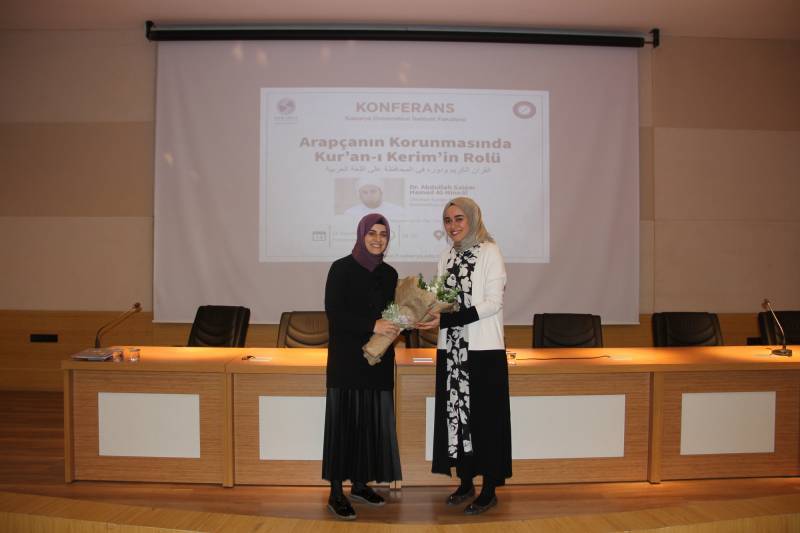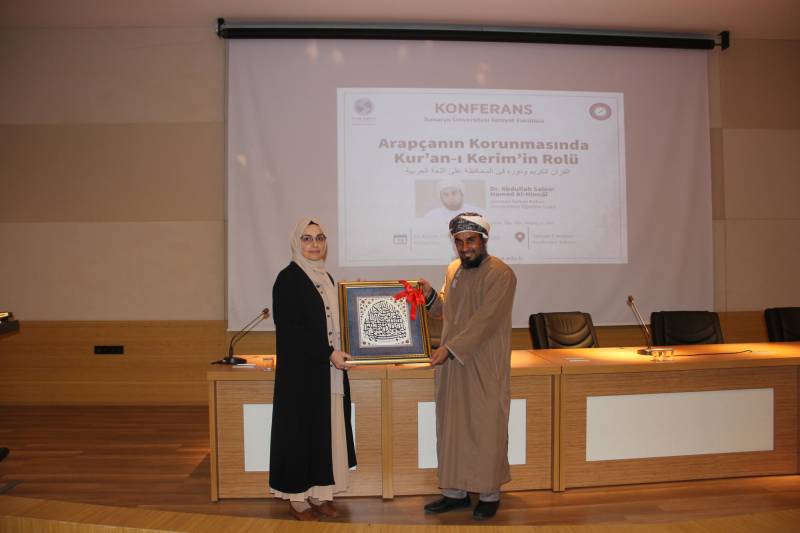 Konferans Dr. Abdullah el-Hinâî ve Öğr. Gör. Sümeyye Atıcı’ya hediyelerinin takdim edilmesi ve öğrencilerle hatıra fotoğrafı çekilmesinin ardından sona erdi.
