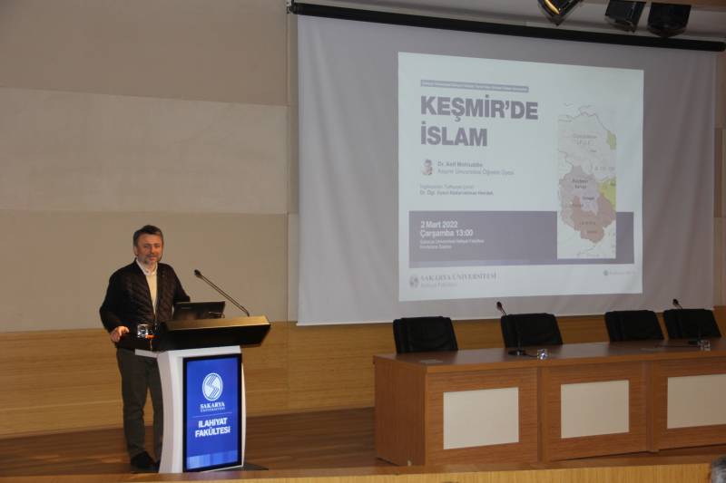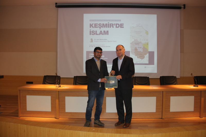 Dr. Asif Mohiuddin konuşmasının başında kendisine bu imkânı sağladıkları için Dekanımız Prof. Dr. Ahmet Bostancı ve Temel İslam Bilimleri Başkanımız Prof. Dr. Süleyman Akkuş’a teşekkürlerini iletti. Dinleyicilere Keşmir haritasını gösteren Dr. Mohiuddin, Keşmir bölgesinin halihazırda Pakistan (Azad Keşmir), Hindistan (Cemmu Keşmir) ve Çin (Aksai) tarafından yönetilen üç kısımdan oluştuğunu belirtti. Öncelikle Keşmir’in İslâm öncesi tarihine değinen Dr. Mohiuddin, devamında Keşmir ve Sind bölgesine Müslümanlar tarafından yapılan ilk fetih girişimleri hakkında bilgi verdi. Söz konusu fetihlerin pek başarılı olamadığını ve Keşmir bölgesinin İslâm’la tanışmasının daha çok sûfîler kanalıyla olduğunu belirten Dr. Mohiuddin, bu bölgeye gelen ilk sûfînin 1295 yılında son Hindi hükümdarlığı döneminde buraya gelen Seyyid Şerefüddin Abdurrahman (Bülbül Şah) olduğunu söyledi.
