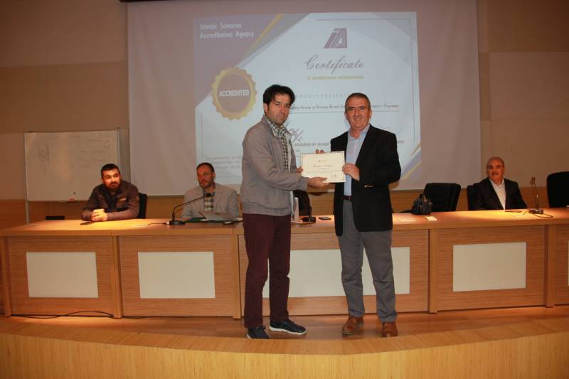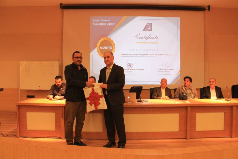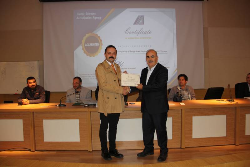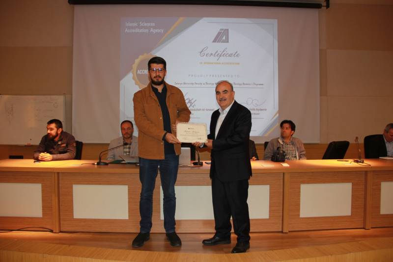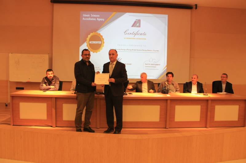 Devamında akreditasyon başarısı dolayısıyla Kalite ve Akreditasyon Kurulu üyelerimiz Prof. Dr. Osman Güman, Dr. Öğr. Üyesi Ziya Erdinç, Dr. Öğr. Üyesi Ayşegül Mete, Dr. Öğr. Üyesi Yunus Kaymaz, Arş. Gör. Dr. Tahir Çağman, Arş. Gör. Halil İbrahim Yılmaz, Arş. Gör. Afife Şeyma Taç ve Osman İşgüven’e, Rektörümüz Prof. Dr. Hamza Al ve Dekanımız Prof. Dr. Ahmet Bostancı tarafından imzalanmış takdir belgeleri ve hediyeleri Dekanımız ve bölüm başkanları tarafından takdim edildi. Prof. Dr. Osman Güman da kalite ve akreditasyon çalışmalarına olan destekleri sebebiyle Dekanımız Prof. Dr. Ahmet Bostancı’ya kurul adına teşekkürlerini iletti ve hediye takdim etti.