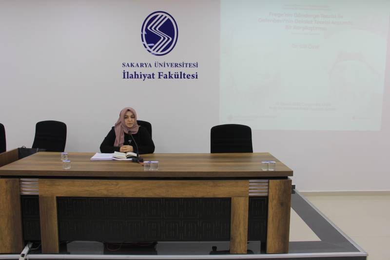 Fakültemiz Felsefe ve Din Bilimleri Bölüm Seminerleri kapsamında Muş Alparslan Üniversitesi, İslami İlimler Fakültesi, Mantık Anabilim Dalı Dr. Öğretim Üyesi Elif Özel tarafından “Frege'nin Gönderge Teorisi ile Gelenbevi'nin Delalet Teorisi Arasında Dair Karşılaştırma” başlıklı bir seminer gerçekleştirildi. Mehmet Erkal Toplantı Salonumuzda gerçekleştirilen programa Üniversitesi’mizden akademisyenler, öğrenciler ve muhtelif meslek mensupları katılım gösterdi.