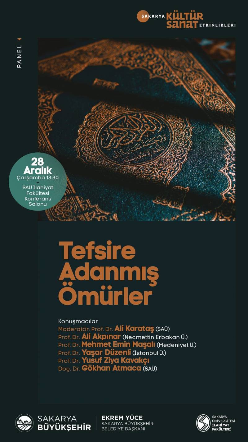 Fakültemiz işbirliği ile Sakarya Büyükşehir Belediyesi Aralık Ayı Kültür Sanat Etkinlikleri Kapsamında düzenlenen “Tefsire Adanmış Ömürler” Paneli 28 Aralık 2022 Çarşamba günü saat 13:30’da Konferans Salonumuzda gerçekleştirilecek.