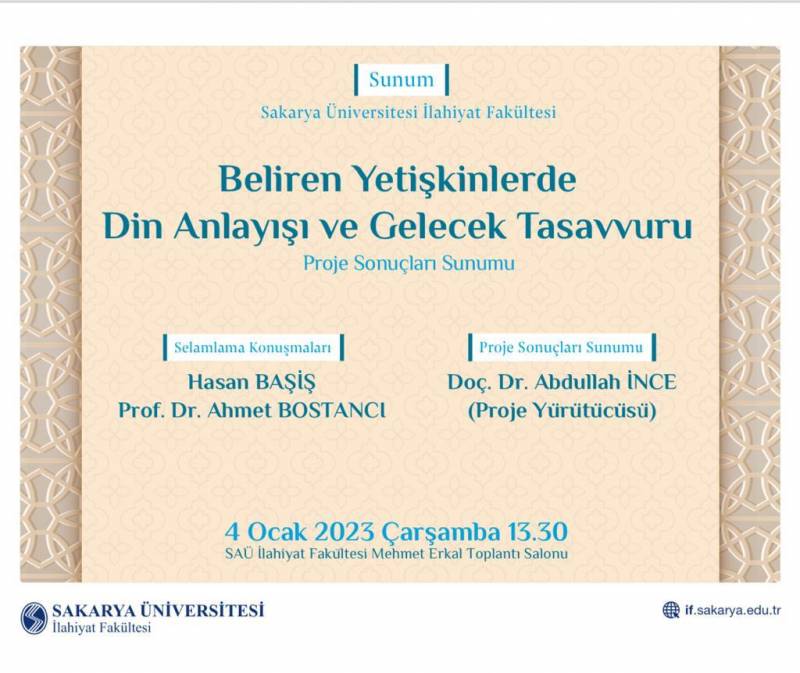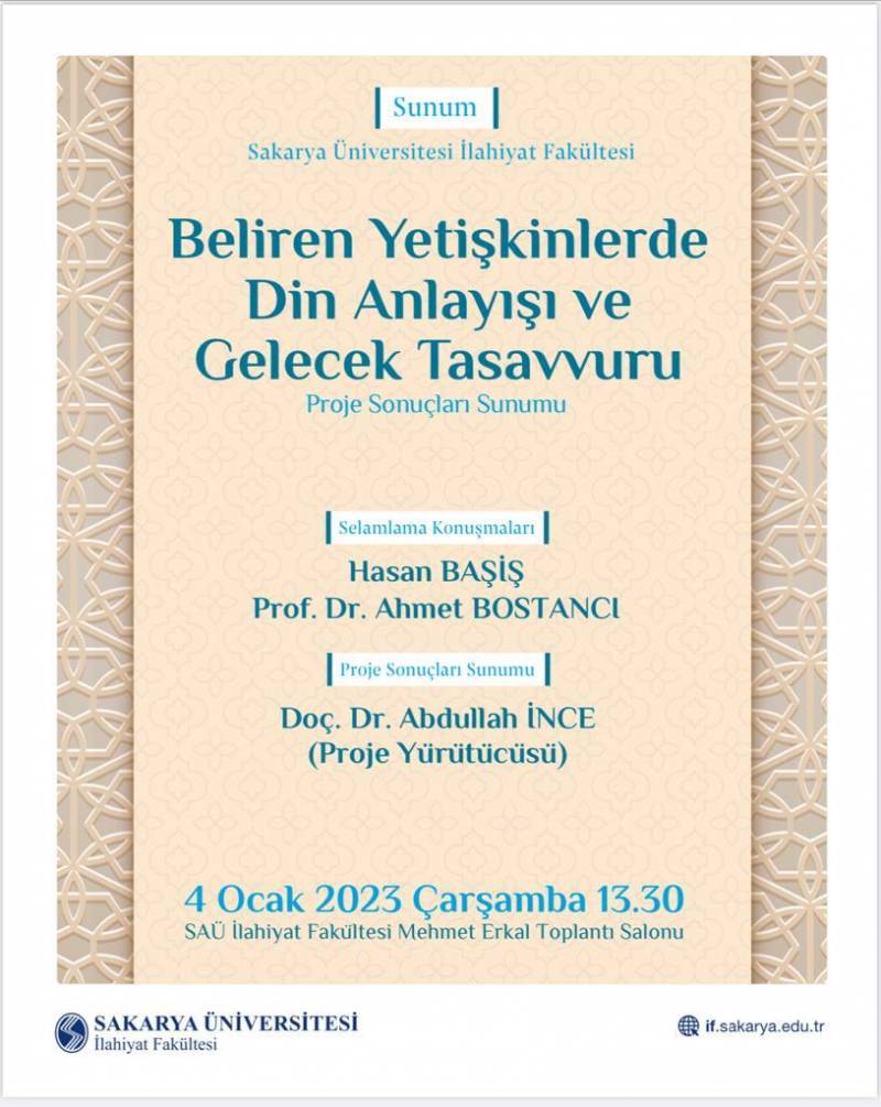 Fakültemiz ve Sakarya İl Müftülüğünce müştereken yürütülen “Beliren Yetişkinlerde Din Anlayışı ve Gelecek Tasavvuru Projesi” çıktılarının sunulacağı toplantı 4 Ocak 2022 Çarşamba günü 13:30’da Prof. Dr. Mehmet Erkal Toplantı Salonumuzda gerçekleştirilecektir.