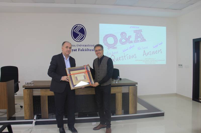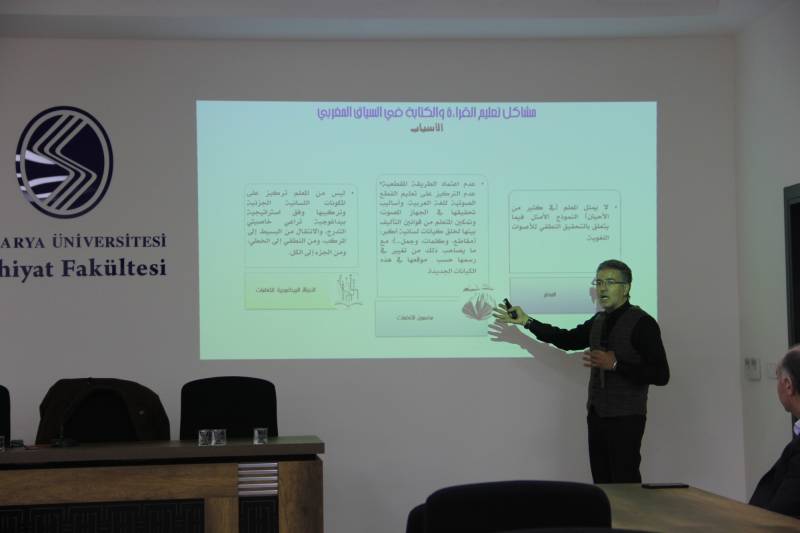 Konferansın sunuculuğunu yapan Arş. Gör. Semra Kaya Aitaouri’nin Prof. Dr. Mostafa Bouanani’nin özgeçmişini aktarmasından sonra konferans başladı. Prof. Dr. Mostafa Bouanani sözlerine Dekanımız Prof. Dr. Ahmet Bostancı’ya teşekkür ederek ve depremle ilgili taziyelerini ve üzüntüsü bildirerek başladı. Sunumunu Arapça olarak gerçekleştiren Prof. Dr. Bouanani, sunumunda anlatacaklarının genel çerçevesini çizerek sözlerini sürdürdü. Anadilin öğreniminden ikinci bir dil öğrenimine kadar pek çok konuyu ele alan Prof. Dr. Bouanani, modern bilişsel yöntemlerin Arapça öğretiminde nasıl kullanılabileceği hususunda ilgi çekici noktalara temas etti ve bu konuda Fas, Mısır gibi ülkelerde yapılan uygulamalar üzerinde durdu. Konferans, dinleyiciler tarafından sorulan soruların cevaplandırılmasının ve Dekanımız Prof. Dr. Ahmet Bostancı tarafından Prof. Dr. Mostafa Bouanani’ye hediye takdiminin ardından sona erdi.