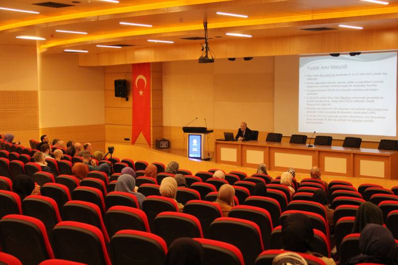 Konuşmasının devamında Hz. Peygamber ve Hulefâ-i râşidîn döneminden inşa edilen Kuba mescidi, Mescid-i nebevî, Basra mescidi, Kufe mescidi, Mescid-i haram, Fustat Amr Mescidi gibi yapıların tarihi ve mimari özellikleri hakkında bilgi veren Prof. Dr. Memiş, Emeviler ve Abbasiler döneminde inşa edilen mimari eserlerin genel özelliklerinden ve bazı örneklerinden bahsettikten sonra sözlerini tamamladı.