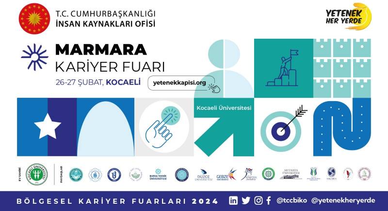 Cumhurbaşkanlığı İnsan Kaynakları Ofisi’nin Koordinasyonu ve Kocaeli Üniversitesi ev sahipliğinde 15 üniversitenin paydaşlığında düzenlenecek olan Marmara Kariyer Fuarı (MARMARAKAF), 26-27 Şubat 2024 tarihlerinde Kocaeli Büyükşehir Belediyesi Kongre Merkezi’nde gerçekleştirilecektir. Ulaşım Üniversitemiz tarafından sağlanacaktır.