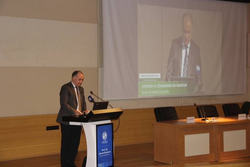 Dekanımız Prof. Dr. Ahmet Bostancı yaptığı açılış konuşmasında, Fakülte olarak depremin ilk gününden itibaren yapılan seferberlikte yer almaya çalıştıklarını ifade etti. Fakülte hocalarından bazılarının deprem bölgesindeki arama kurtarma faaliyetlerine gönüllü olarak katıldıklarını kaydeden Prof. Dr. Bostancı, ayrıca fakülte hocalarından bir ekip kurarak deprem bölgesindeki tüm öğrencilerine ulaşarak maddi ve manevi destek olmaya çalıştıklarını söyledi. Bunun yanında daha kalıcı, ileriye ışık tutacak çalışmalar yapma düşüncesi ile bazı projeler hazırladıklarını kaydeden Dekanımız Bostancı, bu kapsamda yürütücülüklerini Din Sosyolojisi Anabilim Dalı Başkanı Doç. Dr. Abdullah İnce’nin yaptığı ve TÜBİTAK 1002-C kapsamında kabul edilen “Doğal Afetlerde Gençlerde Dini İnanç ve Ruh Sağlığı İlişkisi” Projesi ile DİB Din Hizmetleri Genel Müdürlüğü tarafından desteklenen "Doğal Afetlerde (Deprem) Din Hizmetleri: Tespitler-Öneriler" isimli projelerin yapıldığını aktardı. Fakülte olarak bugüne kadar uluslararası ve ulusal 41 ilmi toplantıyı başarıyla gerçekleştirdiklerini kaydeden Prof. Dr. Bostancı, bu 42. toplantıya ev sahipliği yapmaktan da onur duyduklarını söyledi. Prof. Dr. Bostancı, projeye olan destekleri dolayısıyla Diyanet İşleri Başkanı Prof. Dr. Ali Erbaş’a, Din Hizmetleri Genel Müdürü Dr. Şaban Kondi’ye, çalıştayı ortak olarak gerçekleştirdikleri Sakarya İl Müftüsü Mehmet Aşık’a, çalıştayın tertip ve idaresinde görev alan hocalara ve müftülük personeline, tebliğleriyle katkı sunan hocalara teşekkürlerini iletti.