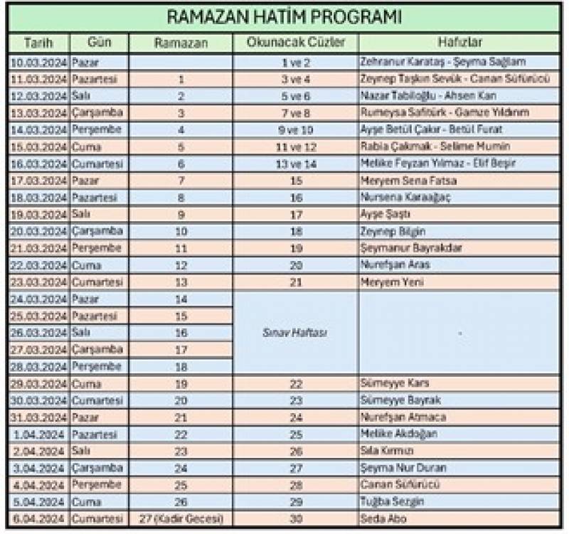 Fakültemizde okuyan hafızlar Ramazan’da mukabele okuyor. Bu Ramazan’da akşamları 22:00’da online olarak düzenlenecek programa fakültemizin kız öğrencileri ve hanım hocaları davetlidir. Hatim Duası yine online olarak yapılacaktır.
