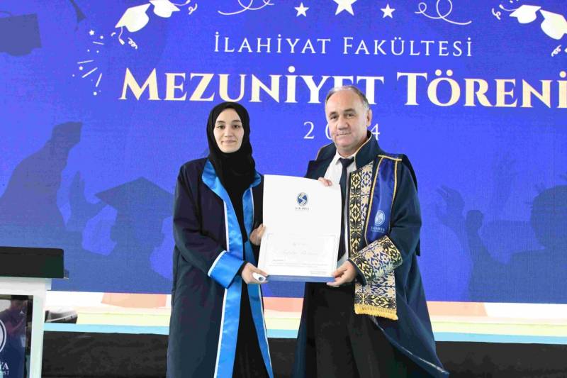 Akabinde fakülteyi ikincilikle bitiren Esra Dönmez, mezunlar adına bir konuşma gerçekleştirerek şu sözlere yer verdi: “Sevgili arkadaşlarım; bizler, ilahiyat mezunu olurken sadece birer diploma almış olmuyor, aynı zamanda güzel ahlakı, adaleti, merhameti ve sabrı temsil eden bir misyonu da yüklenmiş oluyoruz. Bu nedenle değişen ve gelişen dünyaya milli kimliğimizi ve manevi değerlerimizi unutmadan ayak uydurabilen, geleceğe ışık tutabilen gençler olmalı ve bu minvalde İslam adına güzel nesiller yetiştirmek için çaba sarf etmeliyiz.”