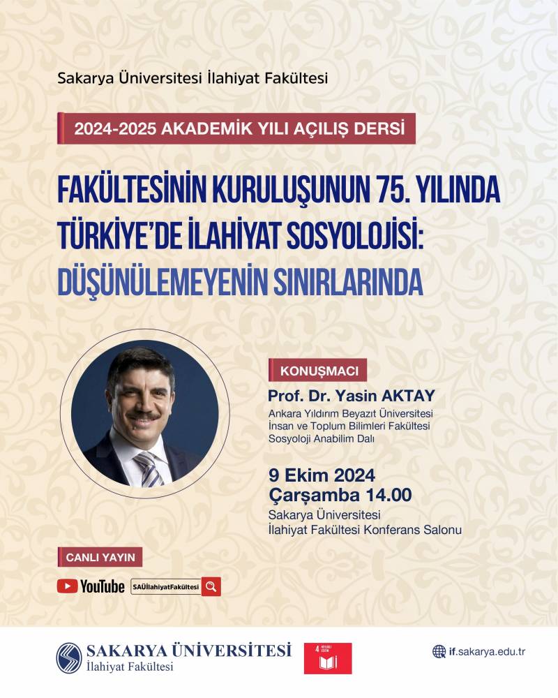 Ankara Yıldırım Beyazıt Üniversitesi Öğretim Üyesi Prof. Dr. Yasin Aktay tarafından verilecek olan “Fakültesinin Kuruluşunun 75. Yılında Türkiye’de İlahiyat Sosyolojisi: Düşünülemeyenin Sınırlarında“ konulu 2024-25 Akademik Yılı Açılış Dersi 9 Ekim 2024 Çarşamba saat 14:00’te Konferans Salonumuzda gerçekleştirilecektir.