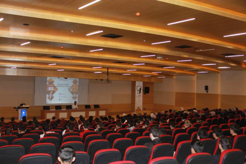 Programın bir sonraki bölümünde Öğr. Gör. Hülya Afacan hazırlık sınıflarında uygulanan kur sistemi hakkında öğrencileri bilgilendirdi. Bunu, 2023-2024 öğretim yılı hazırlık sınıfı öğrencileri arasında birinci olan Ayşenur Bosnalı’nın konuşması ve aynı dönem öğrencilerinden Zeynep Sarohan’ın Ürdün Yaz Kursuna dair hazırlamış olduğu slayt gösterimi takip etti. Ardından Ürdün Yaz kursunda bu yıl başarılı olan iki öğrenciye ödülleri takdim edildi ve öğrencilere Arapça Eğitimi Öğrenci Topluluğunun (Mültekâ Luğati’d-dâd) yaptığı etkinlikleri içeren bir bilgilendirme yapıldı.