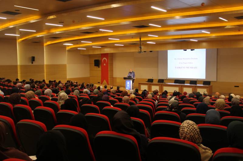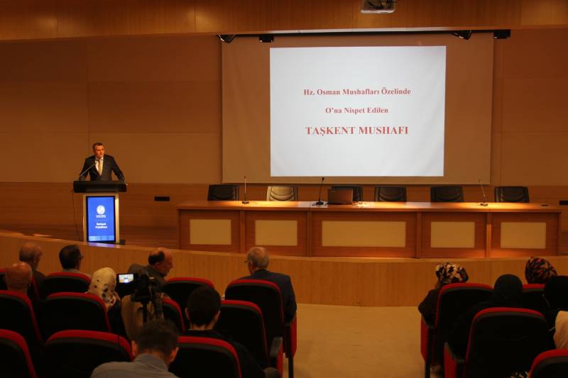 Dr. Tayyar Altıkulaç, konuşmasında öncelikle Kadîm Mushaflara olan ilgisinin nasıl başladığına değindi ve Mushaf tarihi hakkında kısaca bilgi verdi. İlk Mushafın ya da sahifelerin Hz. Ömer’den sonra kızı Hafsa’ya intikal ettiğini belirten Dr. Altıkulaç, Hz. Osman döneminde bu Mushaf esas alınarak altı nüsha yazıldığını ve çeşitli bölgelere gönderildiğini belirtti. Dr. Tayyar Altıkulaç konuşmasının devamında, Hz. Osman’ın Mushafları özelinde Taşkent Mushafı üzerinde durdu. Taşkent Mushafı’nın tarihi hakkında bilgi veren Dr. Altıkulaç, bu mushafın kökeninin Hz. Osman’ın yazdırdığı Kufe Mushafı’na dayandığını belirtti ve esas aldığı kriterler üzerinden bunun nasıl anlaşıldığını çeşitli görsel ve örneklerle dinleyicilere anlattı. Dr. Altıkulaç, Taşkent Mushafı’nın muhtemelen hicri 2. asrın ilk yarısında yazılmış olduğunu ve Müslümanlar arasında yaygın olan kanaatin aksine Hz. Osman’ın yazdırdığı Mushaflardan birisi olmadığını söyledi. Bu kanaatin bugüne kadar devam etmesinde İsmail Mahdum ve Muhammed Hamidullah gibi alimlerin yazdıklarının etkili olduğunu belirtti.