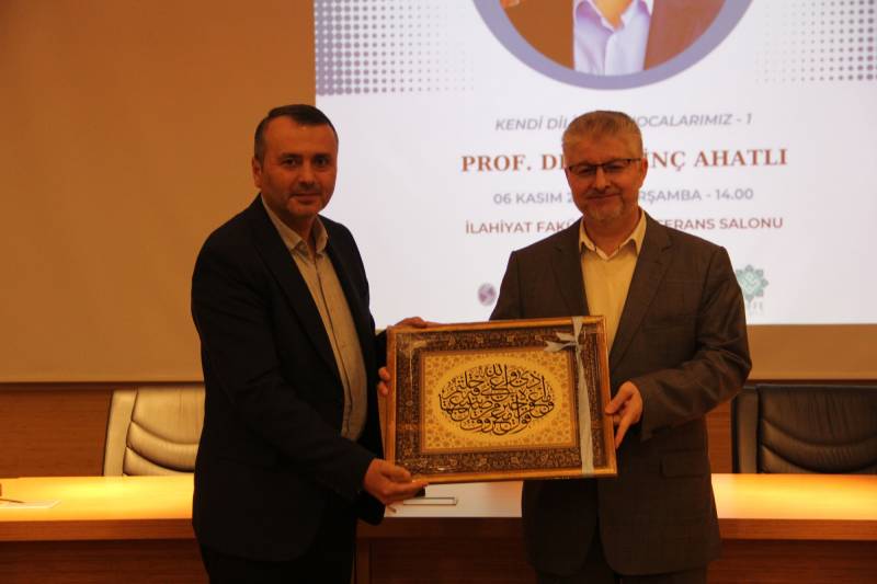 Prof. Dr. Erdinç Ahatlı, konuşmasında kendi dilinden özgeçmişi, eğitim hayatı ve hatıralarından bahsetti. Konuşmasının başında Bulgaristan doğumlu ve kökenli olduğunu belirten Prof. Dr. Ahatlı, öncelikle doğduğu bölge, ailesiyle birlikte Bursa’ya göç hikayesi ve Bursa’da İmam Hatip Okuluna kayıt süreci hakkında dinleyicilere bilgi verdi. Daha sonra ise Marmara Üniversitesi İlahiyat Fakültesi’ne intisabı, lisans eğitimi boyunca fakülte dışında Hadis Enstitüsü’nde katıldığı dersler, tanıştığı isimler, üzerinde etkili olan hocaları ve buradaki hatıralarından bahsetti. Devamında Bursa Uludağ Üniversitesi’ndeki yüksek lisans ve Marmara Üniversitesi’ndeki doktora eğitimi hakkında konuşan Prof. Dr. Ahatlı, 1993 yılında Sakarya Üniversitesi İlahiyat Fakültesi’ne araştırma görevlisi olarak atanma süreci ve buradaki bazı hatıralarından bahsettikten sonra konuşmasını tamamladı.
