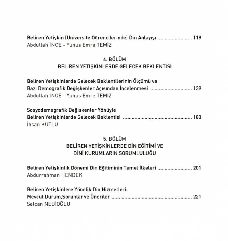 Proje tamamlanmakla birlikte proje verilerine dayalı akademik çalışmalar devam ediyor. Bunlardan biri olan Proje Yürütücüsü Doç. Dr. Abdullah İNCE’nin editörlüğünü yaptığı “Beliren Yetişkinlerde Din, Gelecek ve Eğitim” isimli kitap çalışması, Aralık ayı içerisinde yayınlandı. Çalışmada, teorik ve pratik yönleri açısından beliren yetişkinlikte din anlayışı, gelecek beklentisi ve beliren yetişkinlere yönelik din hizmetlerini içeren bölümler yer alıyor.