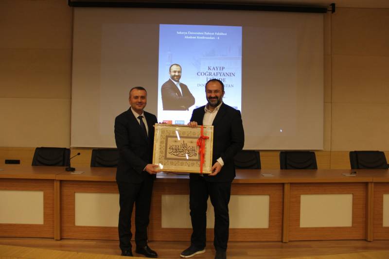 Yoğun ilgiyle karşılanan konferansın sonunda, Dekanımız Prof. Dr. Hasan Meydan, Taha Kılınç’a hediye takdiminde bulundu.