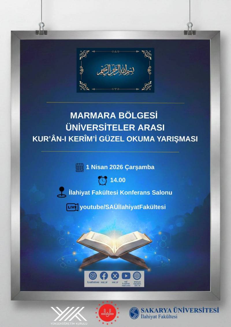 Diyanet İşleri Başkanlığı ve Yükseköğretim Kurulu iş birliğiyle düzenlenen Marmara Bölgesi Öğrenciler Arası Kur'an-ı Kerim'i Güzel Okuma Yarışması Sakarya Üniversitesi İlahiyat Fakültesi ev sahipliğinde gerçekleştirilecektir.