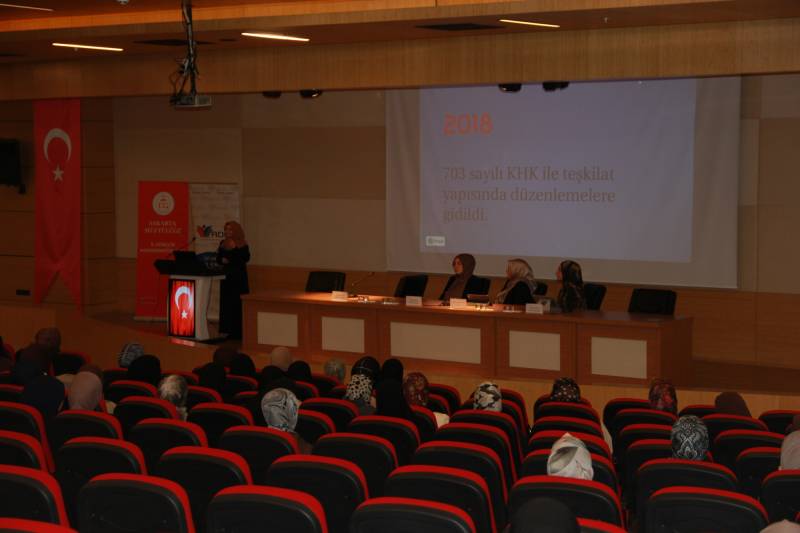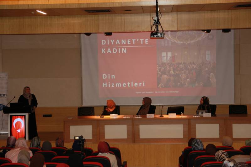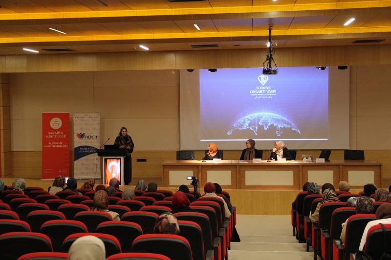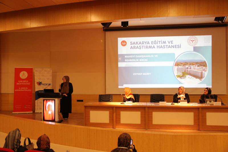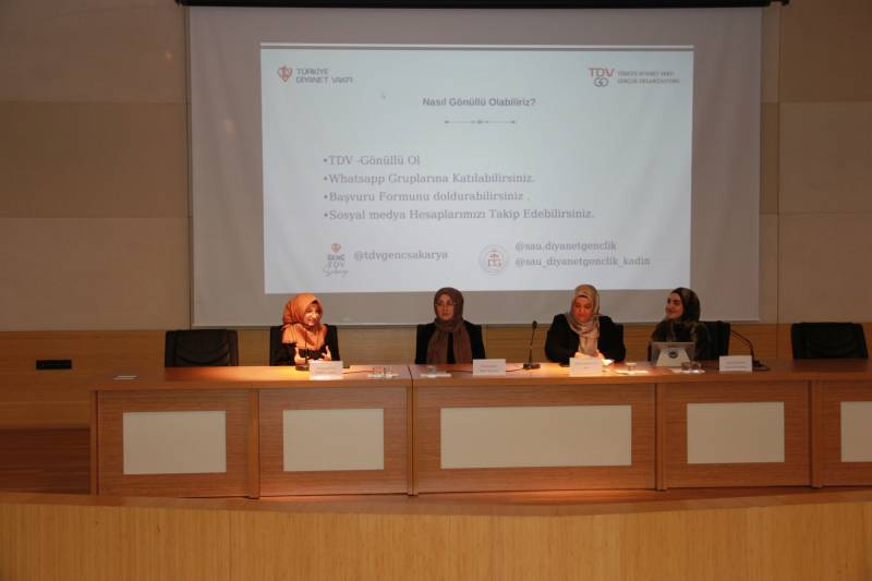 Sakarya İl Müftü Yardımcısı Dr. Ravza Cihan’ın moderatörlüğünü yaptığı panelde panelist olarak Sakarya Müftülüğü Vaizi Dr. Sevim Demir Akgün, Manevî Danışman Zeynep Merey ve TDV Genç Gönüllüsü Zeynep Sıla Eren söz aldı. Dr. Ravza Cihan, Diyanet İşleri Başkanlığı’nın teşkilat yapısı ve hizmet alanları hakkında bilgiler ve meslekî tecrübelerini sunmasının yanında öğrencilerin İlahiyat eğitimi ile birlikte kendilerini geliştirebilecekleri ek çalışmalar yapmaları, kıraat, dinî mûsikî, Arapça ve özellikle dil öğrenmeye yatkın olanların ilave yabancı dil, işaret dili, Braille alfabesi vb. alanlara yönelmelerinin din hizmetlerinde farklı alanlarda kıymetli çalışmalar yapabilmeleri için önemine işaret etti. Manevî Danışman Zeynep Merey ise özellikle sağlık tesislerindeki manevî danışmanlık hizmetlerinin gelişim sürecinden ve yaşadığı deneyimlerden çok önemli bilgiler aktardı. Manevî danışman olmak isteyenlerin öncelikle Diyanet İşleri Başkanlığı bünyesinde göreve başlamaları, ardından talep edilen yeterlilikleri sağlayarak müracaat etmeleri gerektiğine değinen Merey, başta din psikolojisi olmak üzere din eğitimi ve ilgili alanlarda yüksek lisans yapmanın bu konuda bir avantaj sağladığından bahsetti. Vaiz Dr. Sevim Demir Akgün ise 2004 yılı itibarıyla yürüttüğü görevi hakkında vaizlik alım süreçleri hususunda bilgiler vermenin yanında özellikle yaşadığı ve unutamadığı bazı örneklerden bahsederek duygusal anlar yaşanmasına vesile oldu. Vaizlerin ve kurum bünyesindeki din hizmetleri uzmanlarının hastaneler, cezaevleri, sevgi evleri, gençlik merkezleri gibi yerlerde toplumun çok farklı kesimlerine hizmet verdiğini vurguladı. Son olarak İlahiyat Fakültesi öğrencisi Zeynep Sıla Eren, fakültedeki hayatının ve Genç TDV gönüllüsü olmanın kendisine kattıklarından samimi bir dille bahsetti. Sakarya Müftülüğü Gençlik Koordinatörlüğü bünyesinde aktif bir şekilde etkinlikler düzenlendiğini, kitap tahlili, Salı buluşmaları, geziler vb. birçok faaliyetin düzenli olarak devam ettiğini, TDV katkılarıyla mobil mutfak ve mobil ilkyardım aracının devreye girdiğini ifade etti.