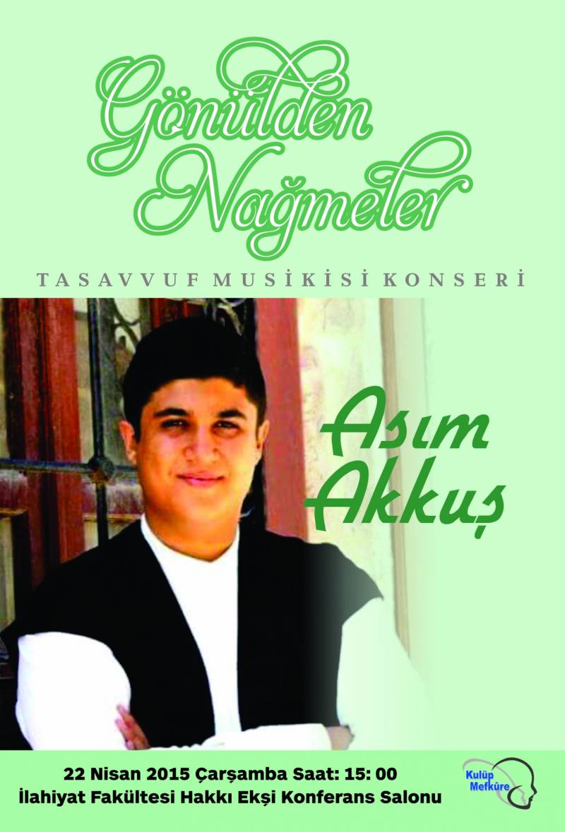 22 Nisan 2015 Çarşamba günü Asım AKKUŞ tarafından "Tasavvuf Musikisi Konseri" sunulacaktır.