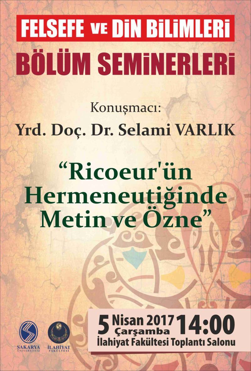 Fakültemiz Felsefe ve Din Bilimleri Bölüm Seminerleri kapsamında 29 Mayıs Üniversitesi öğretim üyelerinden Yrd. Doç. Dr. Selami Varlık tarafından "Ricoeur'ün Hermeneutiğinde Metin ve Özne" başlıklı bir sunum yapılacaktır. Afiş ektedir.