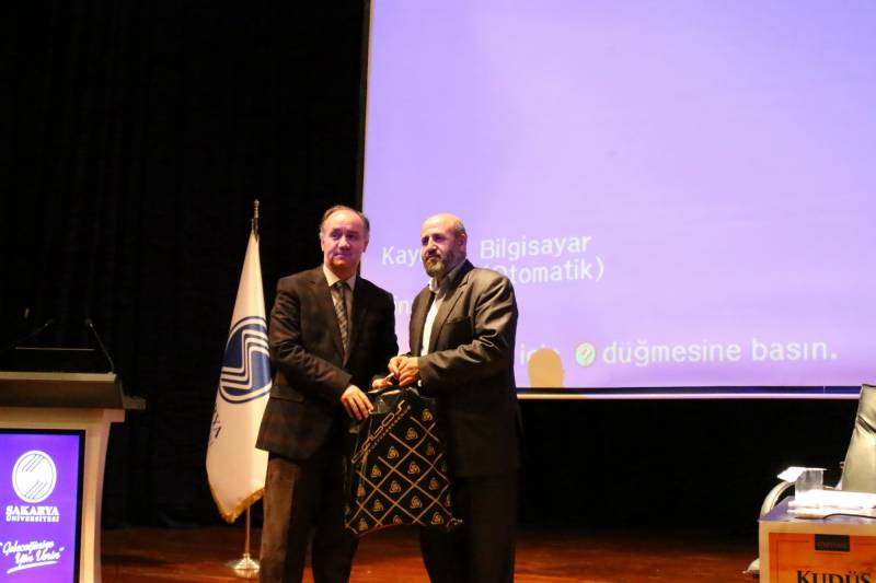 Etkinliğin sonunda Filistinli Âlimler Heyeti Başkanı Dr. Nevaf Tekruri’ye Dekanımız Prof. Dr. Ahmet Bostancı tarafından günün anısına hediye takdim edildi.