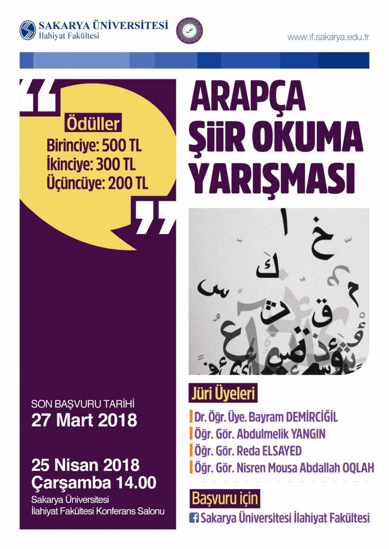 Fakültemiz öğrenci topluluklarından Arapça Dil Grubu Öğrenci Topluluğu (Multeka Lugati’d-dât) tarafından düzenlenen Arapça Şiir Okuma Yarışması 25 Nisan 2018 tarihinde yapılacaktır.