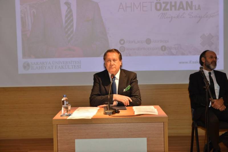 Konuşmasının başında varlık sebebimizin Allah’ı bilmek, O’nu sevmek ve O’na olan kulluk vazifesini yerine getirmek olduğunu vurgulayan Sanatçı Ahmet Özhan “Bütün meslekler, bütün uğraşlar aklımıza ne gelir ise hepsi vasıtadan ibarettir, kulluğa vasıta olmanın haricinde hiçbir meslek yoktur. Bizim yaratılış sebebimiz kul olmaktır. O zaman yaptığımız her şeyde uğraştığımız her şeyde Cenâb-ı Hak’ın bizi yaratış sebebi olan ve bizim yükümlü olduğumuz şeyi ortaya koyabilmek lazım. Kabiliyetlerimiz bizim nefsimizi hoş etmek veya nefsimizi yüceltmek adına harcanması gereken şeyler değil, onlarla Cenabı hakkın yaratmış olduğu varlık aleminde Cenâb-ı Hak’ı temsilen, O’nun halifesi olarak gereğini yerine getirmek bizim varlık sebebimizdir.” dedi.