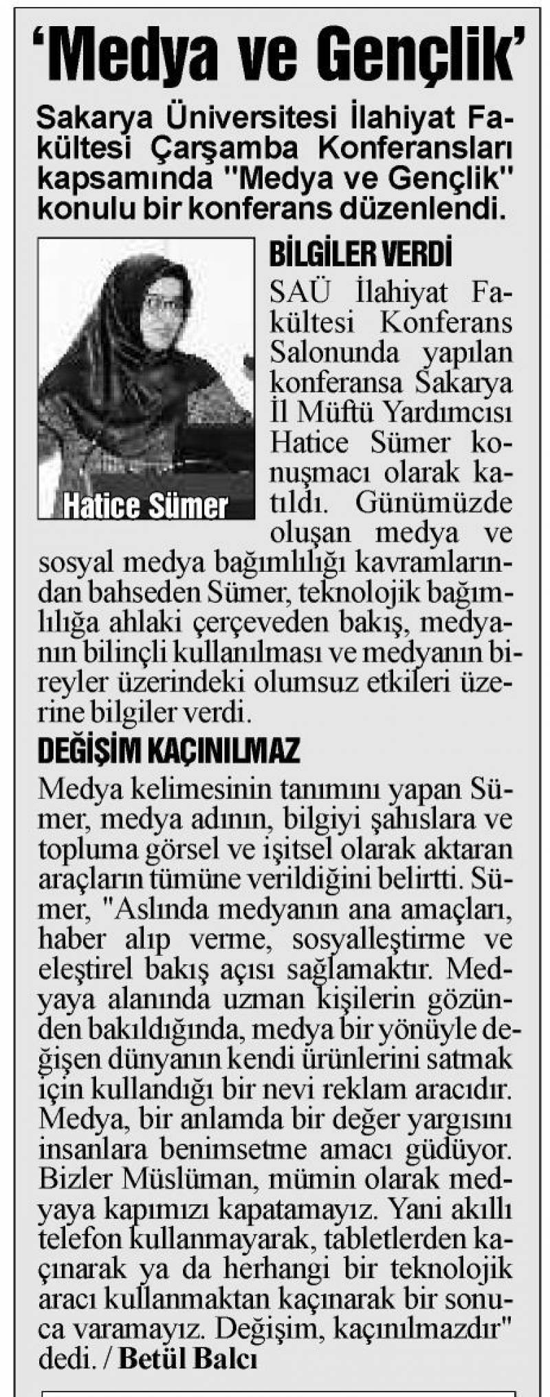 Fakültemiz Arapça Dil Grubu Öğrenci Topluluğu (Mültekâ Lugati’d-dâd) tarafından düzenlenen ve Sakarya İl Müftü Yardımcısı Hatice Sümer tarafından verilen “Medya ve Gençlik” konulu konferans Fakültemiz Konferans Salonunda gerçekleştirildi.