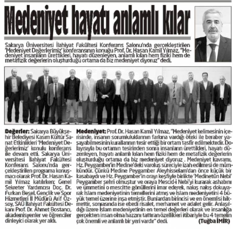 Fakültemiz işbirliği ile Sakarya Büyükşehir Belediyesi Kasım Ayı Kültür Sanat Etkinlikleri Kapsamında düzenlenen ve Prof. Dr. Hasan Kamil Yılmaz tarafından verilen "Medeniyet Değerlerimiz" konulu konferans Fakültemiz Konferans salonunda gerçekleştirildi.