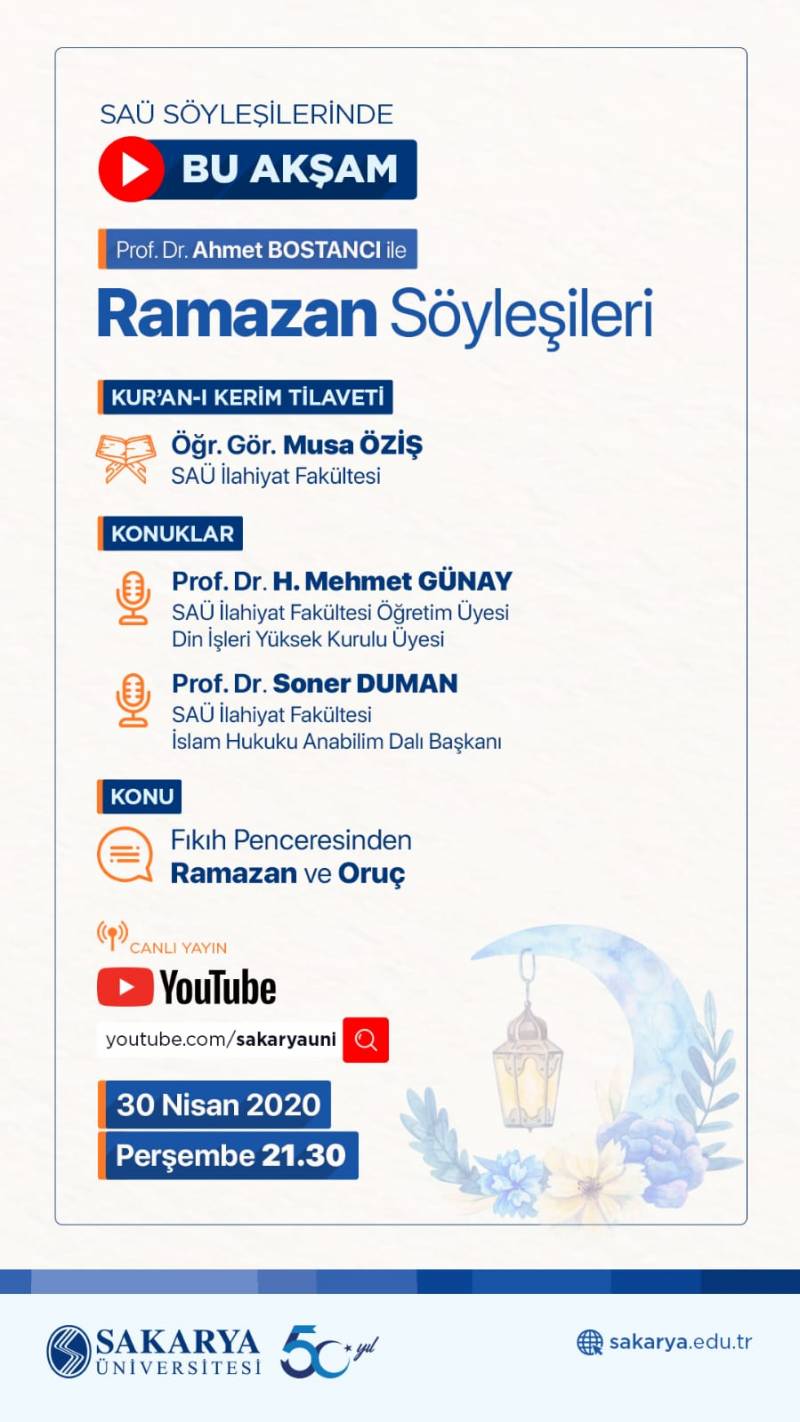 Ramazan Söyleşileri’nin ilk programı bu akşam 21:30’da Dekanımız Prof. Dr. Ahmet Bostancı’nın moderatörlüğünde öğretim üyelerimizden Din İşleri Yüksek Kurulu Üyesi Prof. Dr. H. Mehmet Günay ve İslam Hukuku Anabilim Dalı Başkanımız Prof. Dr. Soner Duman’ın katılımı ve Öğr. Gör. Musa Öziş’in Kur’an-ı Kerim tilavetiyle gerçekleştirilecektir.