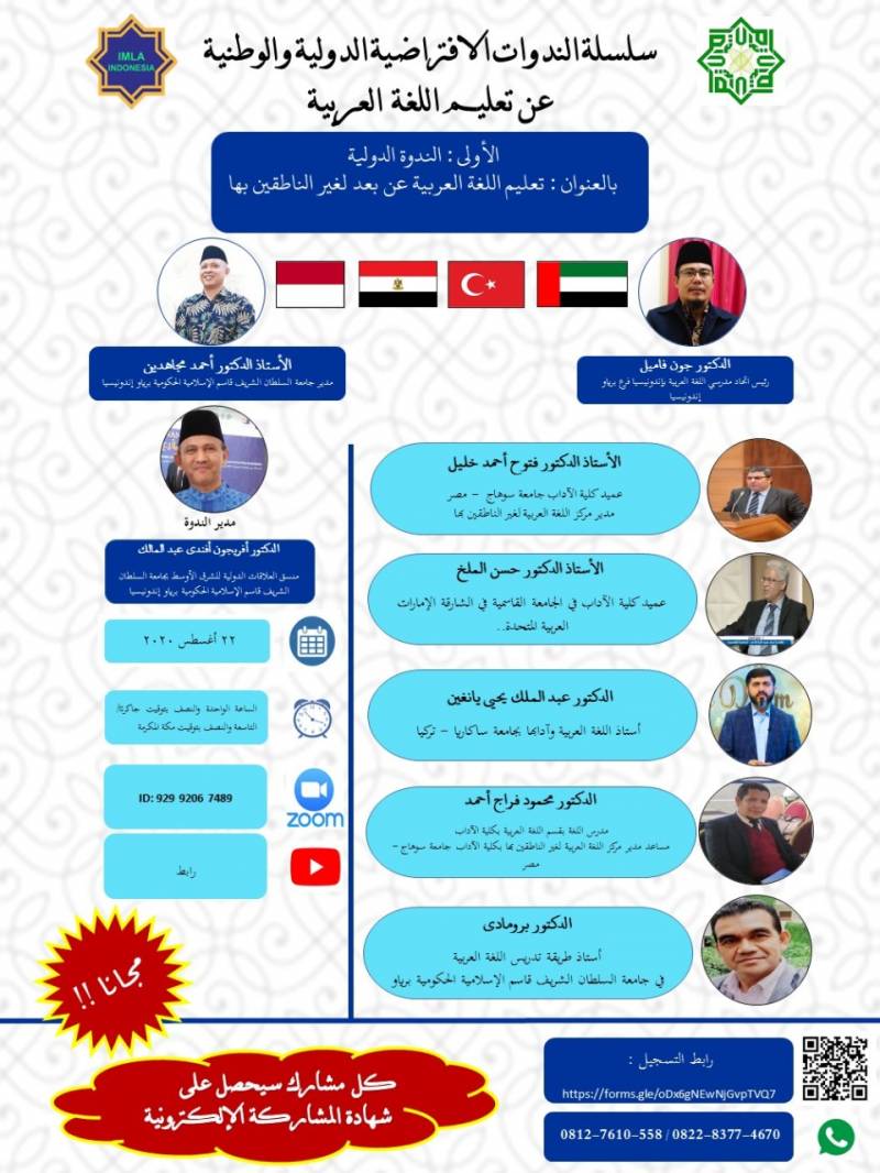 Öğretim görevlilerimizden Abdulmelik Yangın, Endonezya Sultan Şerif Kasım İslam Üniversitesi tarafından online olarak düzenlenen “Anadili Arapça Olmayanlara Uzaktan Eğitim Yoluyla Arapça Öğretimi” konulu uluslararası çalıştaya katılarak Arapça bir sunum yaptı.