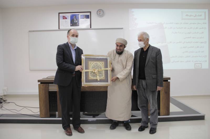 Programın sonunda dekanımız Prof. Dr. Ahmet Bostancı ve Temel İslam Bilimleri Bölüm Başkanı Prof. Dr. Süleyman Akkuş tarafından Dr. Abdullah el-Hinnâî’ye hediye takdim edildi.